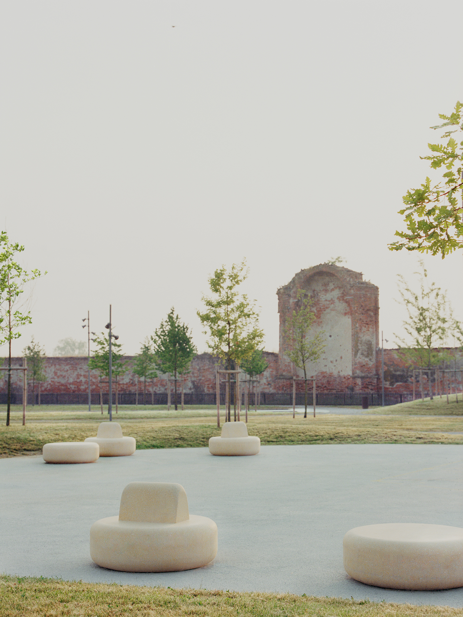 The project for the new public park in Mulazzano creates a unique urban space that is both inclusive and safe, a protected yet permeable place where the community can nurture a shared sense of belonging.