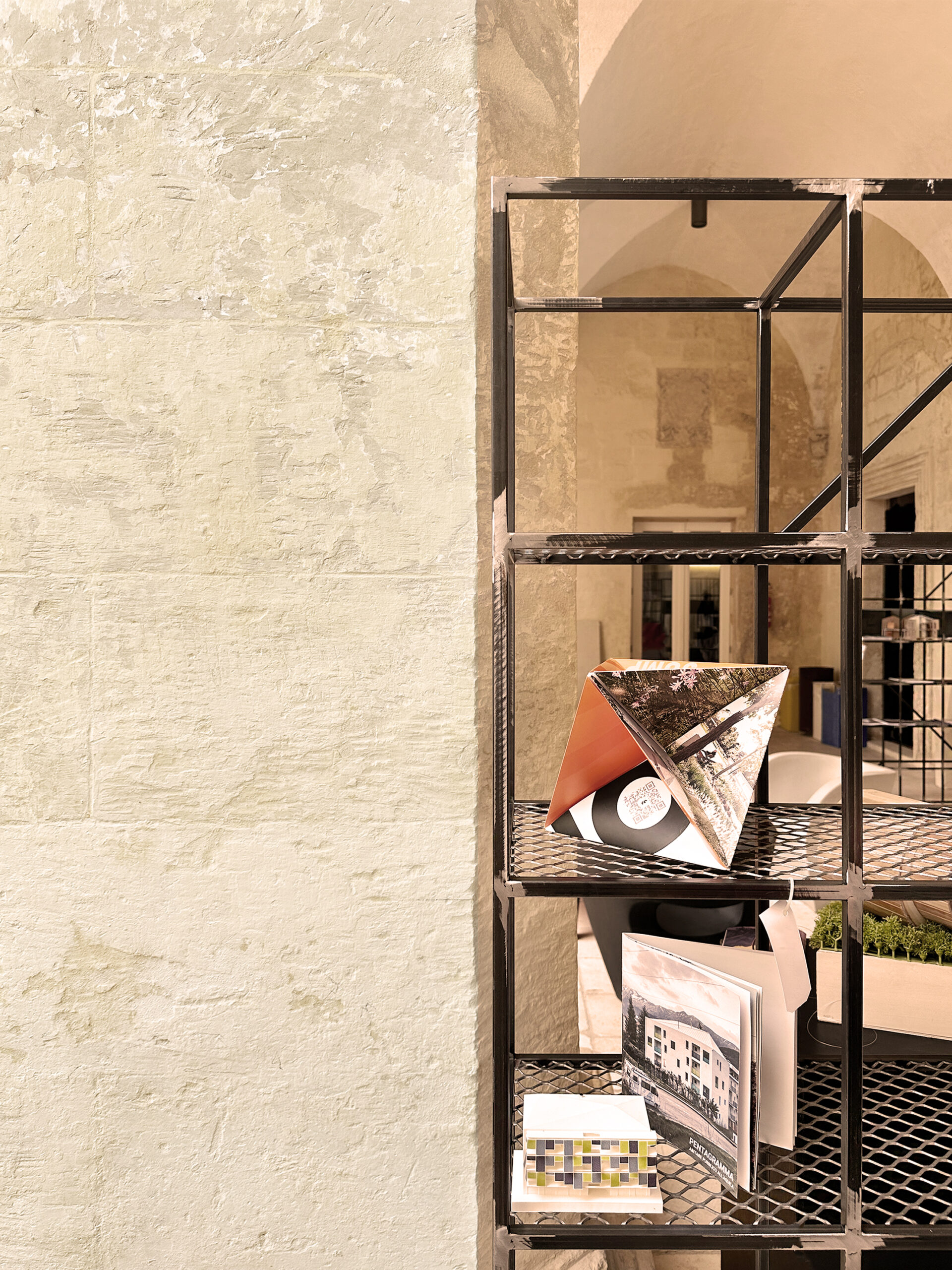 Within these transparent volumes, the shelves in expanded black steel host materials, drawings, and models in a delicate balance of lightness and precision.