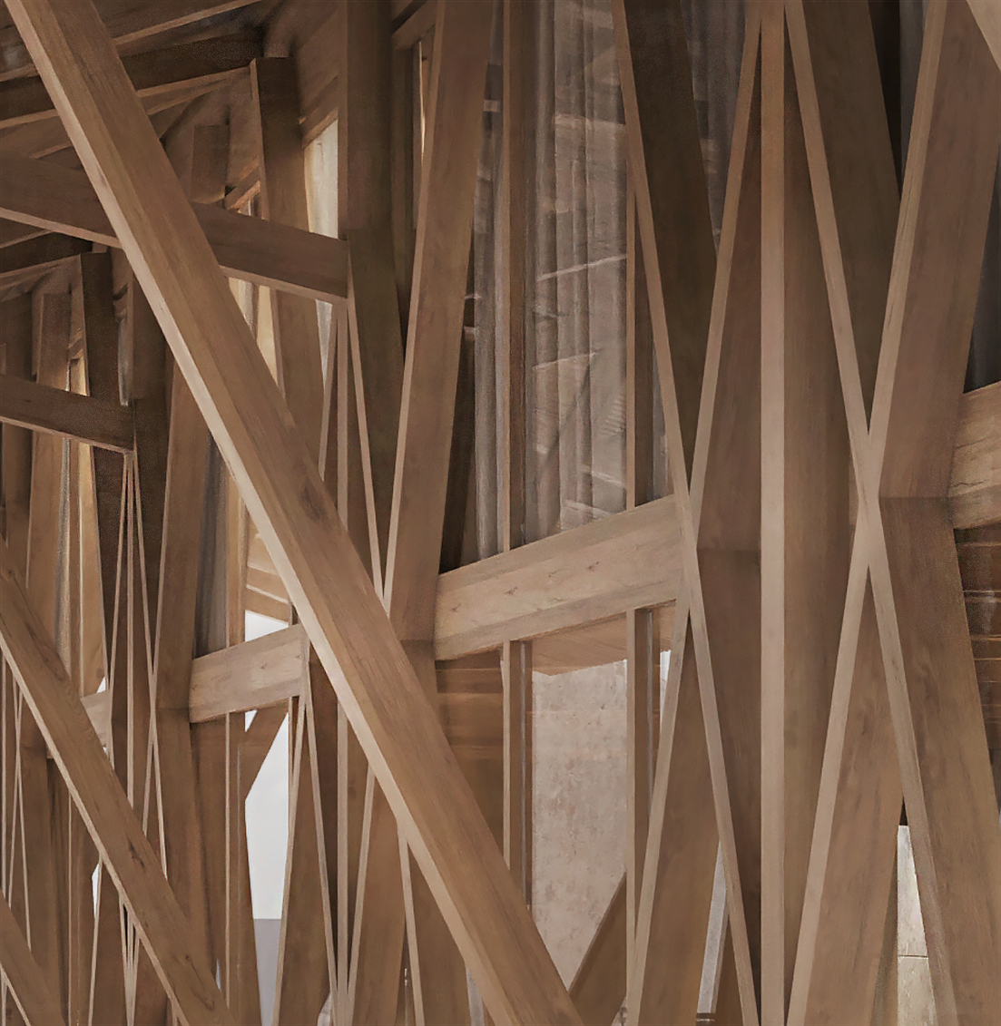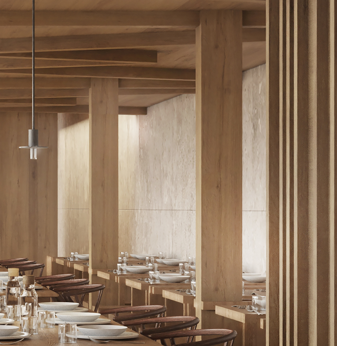 This is where the proposal invests its full representative character: designed in the elementary section of a sloping roof, a large suspended roof is placed close to the slope, creating a lightweight envelope that preserves a space below, ideal for escaping heavy rain, persistent snow, the relentless summer sun, and the lashing winds.