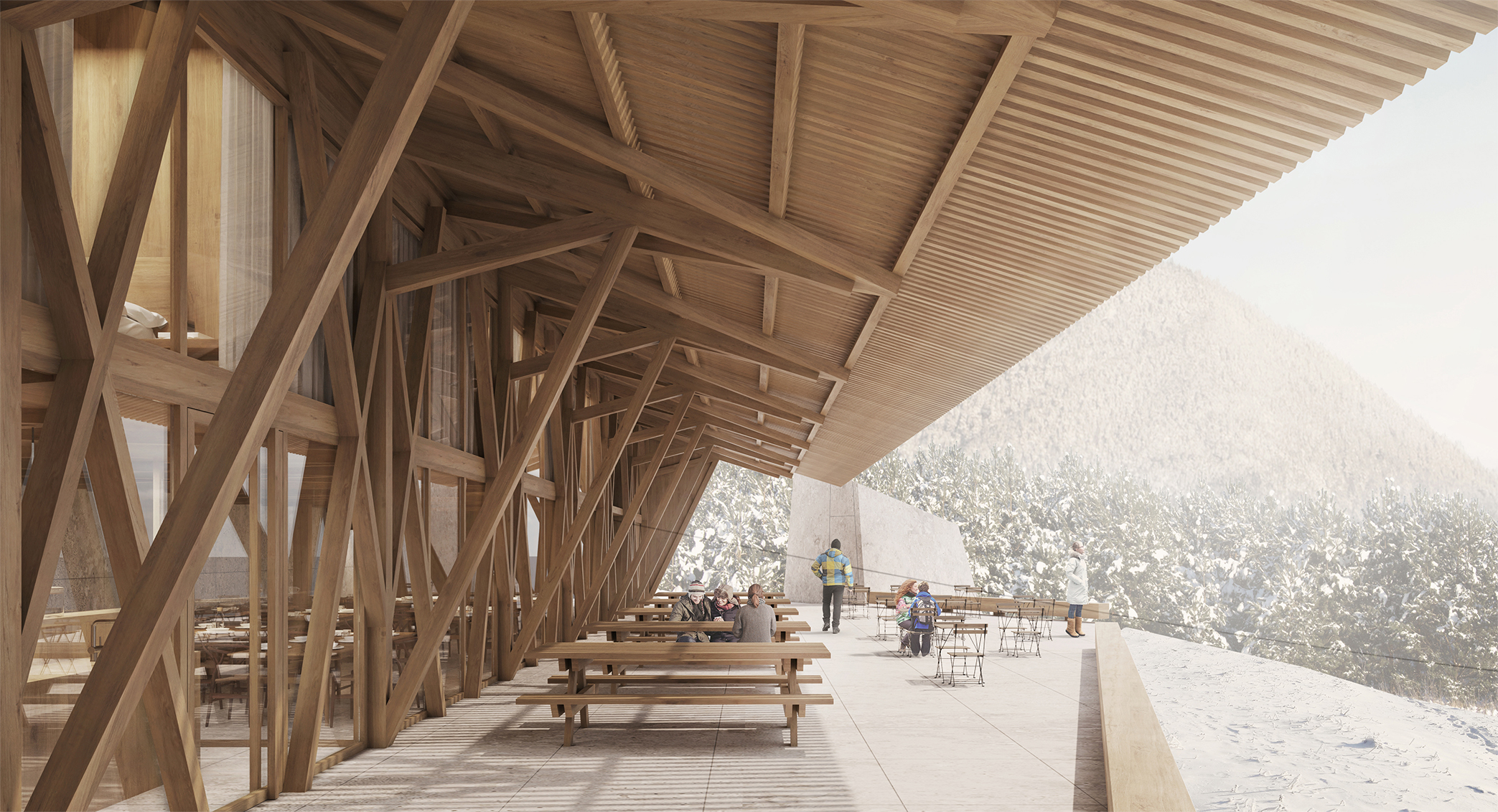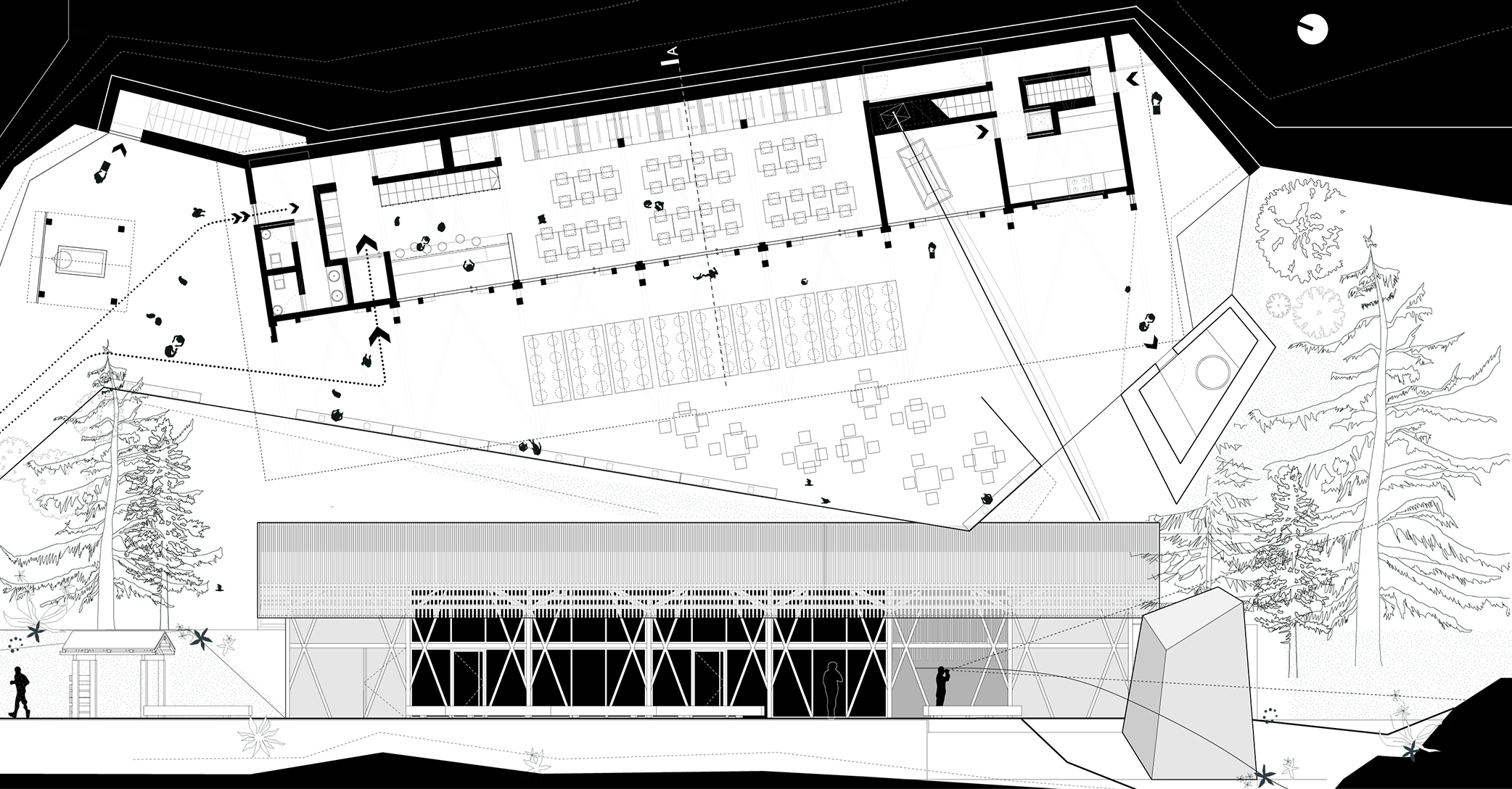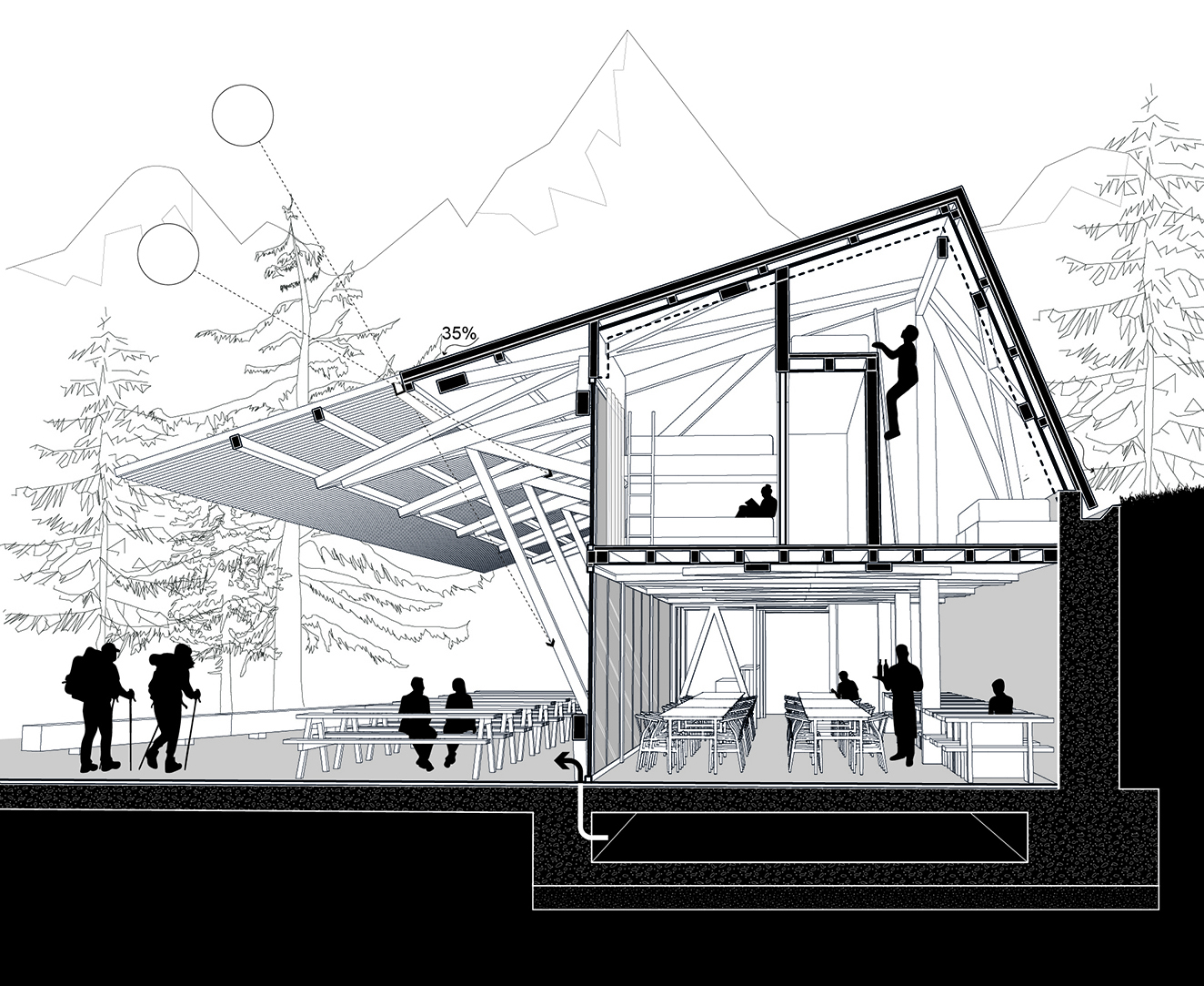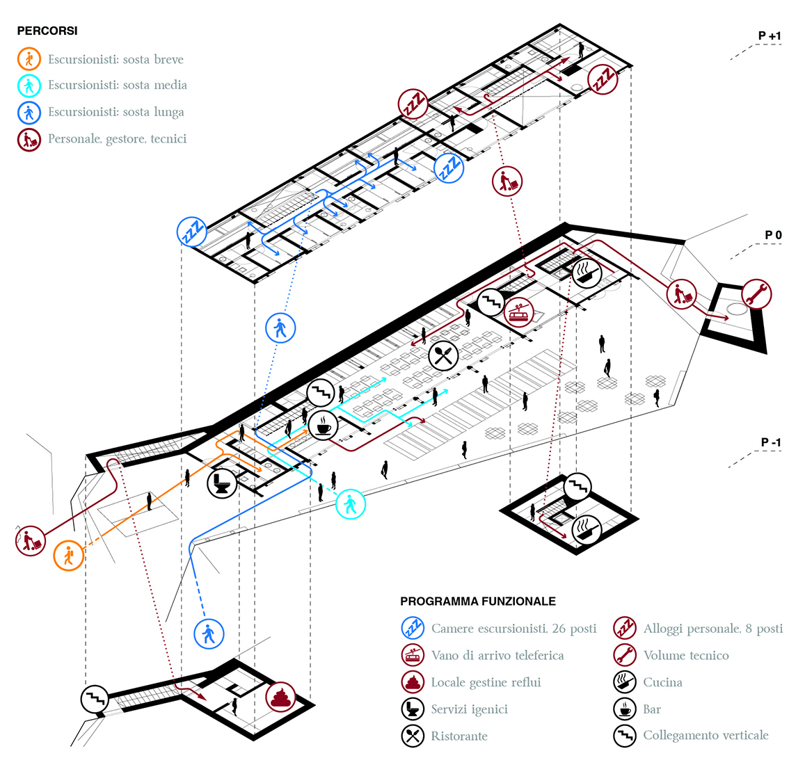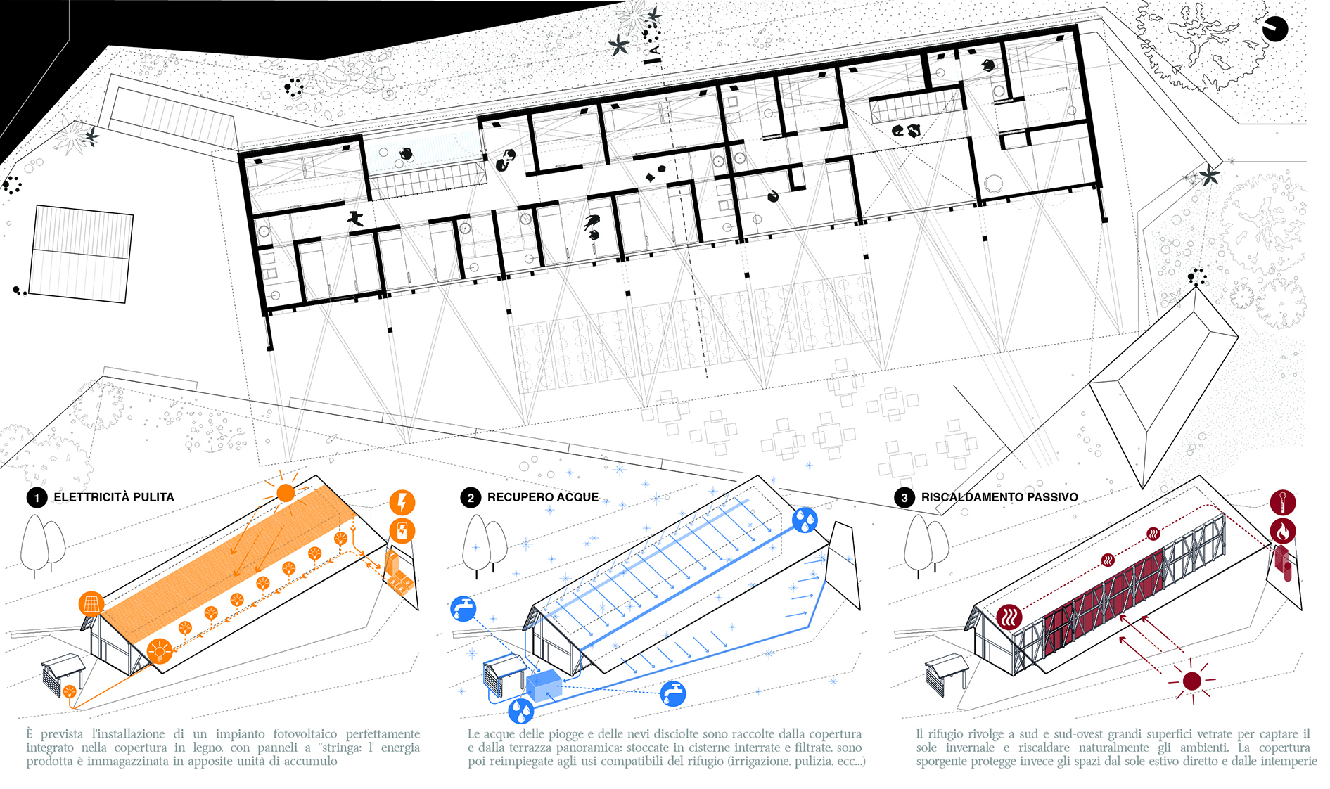 In fact, the project ideally constitutes a large, “defensive” canopy against the hostile environment and a “protective” one for people, whom it beckons with an inclusive and enveloping attitude, communicating even from afar. The gabled roof is conceived as a unified and uninterrupted compositional device, with the ridge line running approximately along the north-south axis, similar to the architectural structure of the mountain hut, located nearby but at a slightly higher altitude.