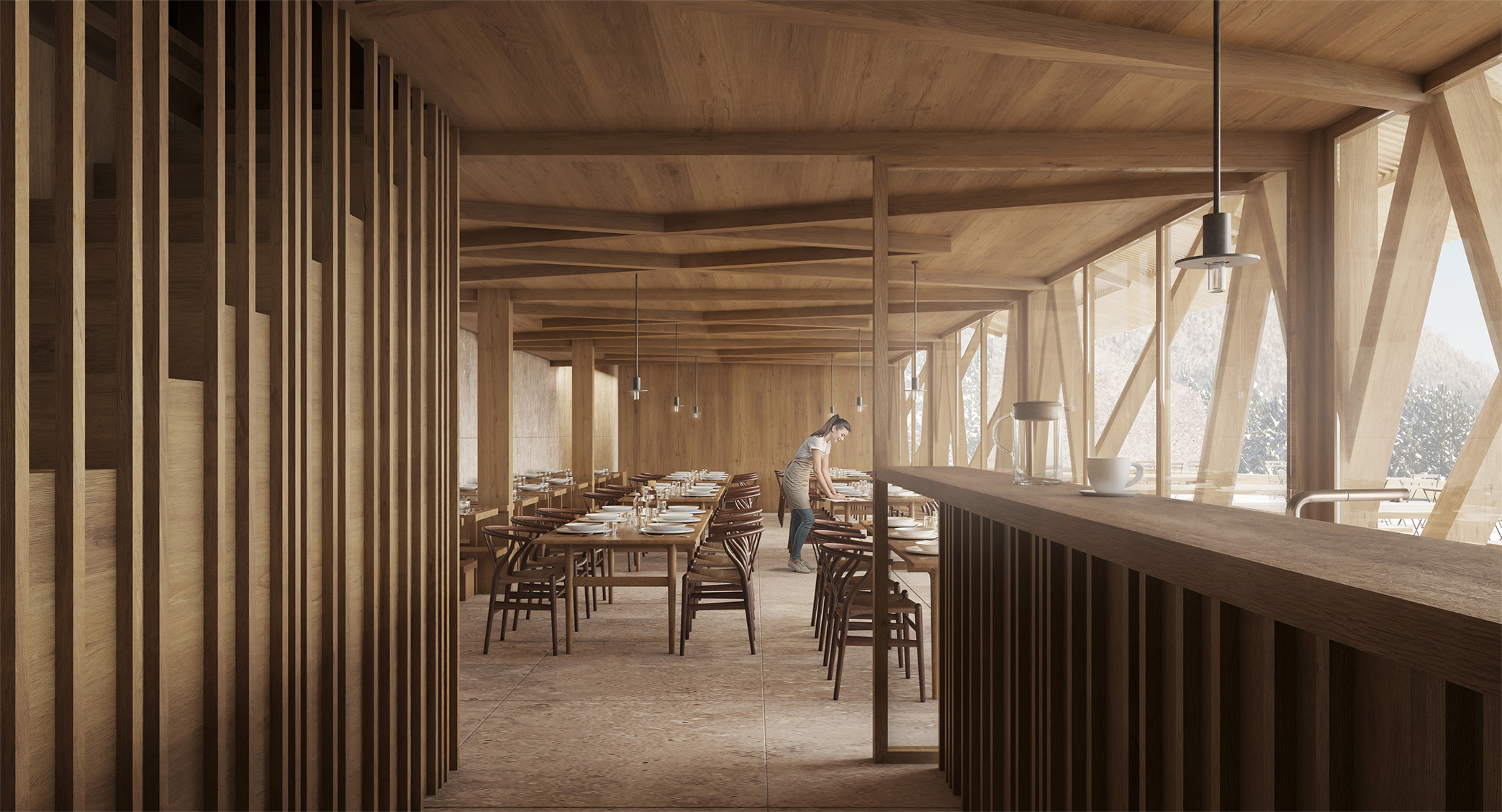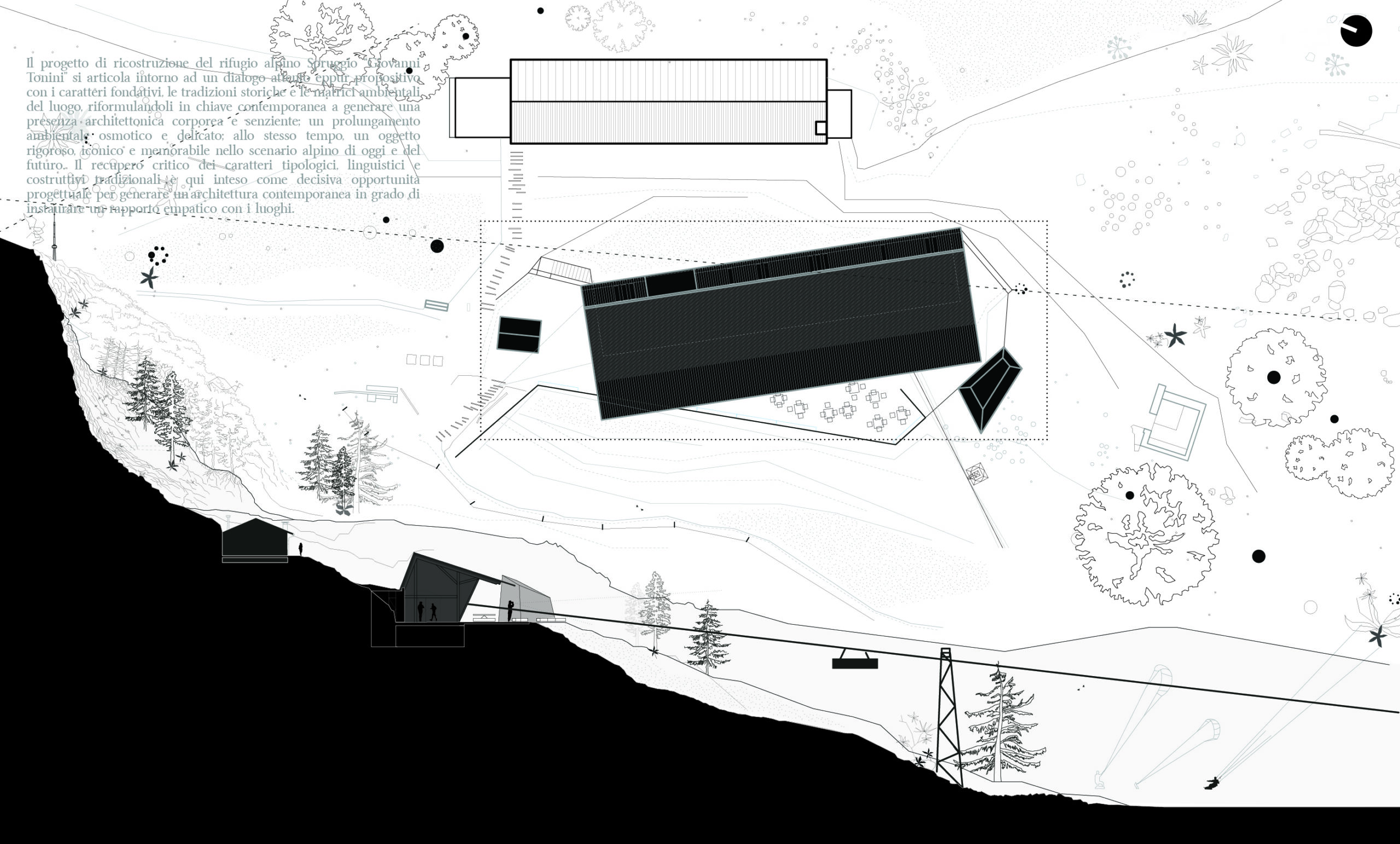 The competition project’s main strategic choice revolves around the desire to architecturally embody the very essence of the idea of ​​a refuge: that of a place, mental even before physical, where one can find shelter and protection from the often challenging conditions of the high mountains. A place where one can feel safe, find a hot meal, and rest before returning to face the strenuous challenges of the peaks. In short, what, even in everyday language, is the image of a roof over one’s head.