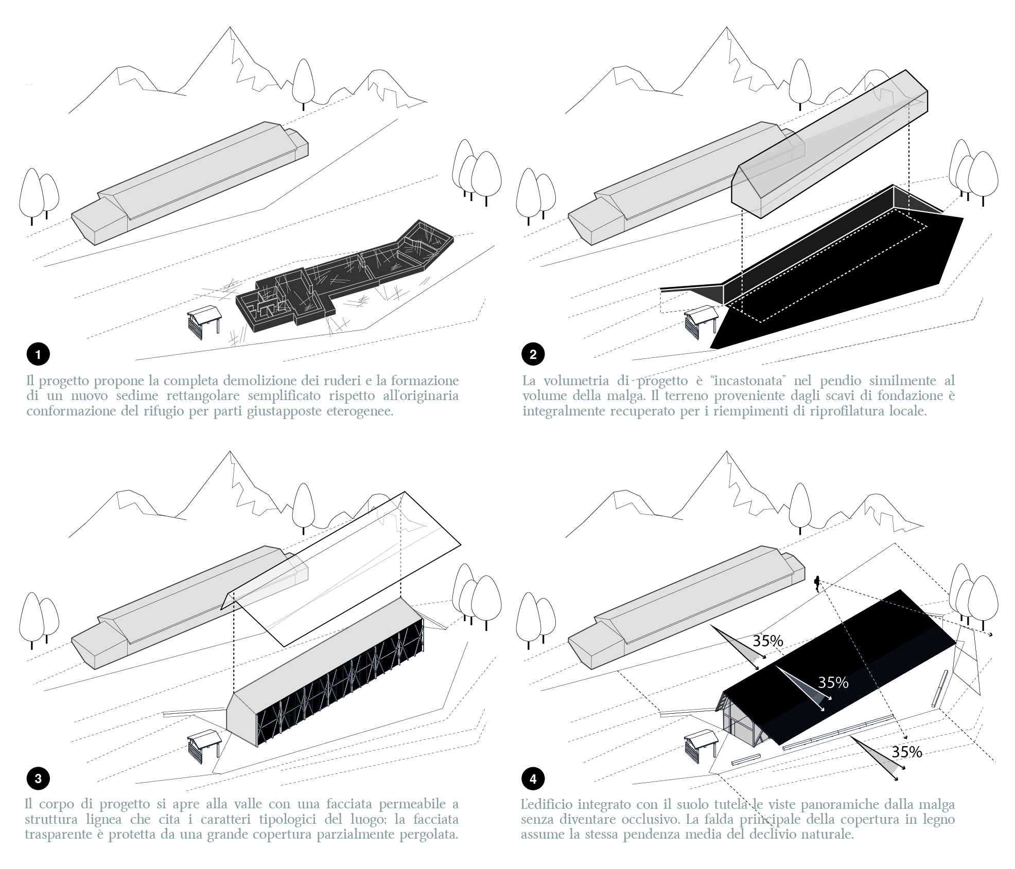 The shared relationship with the mountain hut, almost touching in its rigorous simplicity, does not end there. Indeed, the new refuge building adopts not only its orientation and linear development, but also its partial location within the slope descending to the valley. Just as the mountain hut is “embedded” in the mountain and emerges entirely from it with only its western facade, so too is the new refuge, which positions its living “volume” on the eastern edge of the development area, thus gaining direct protection from the slope into which it is embedded.
